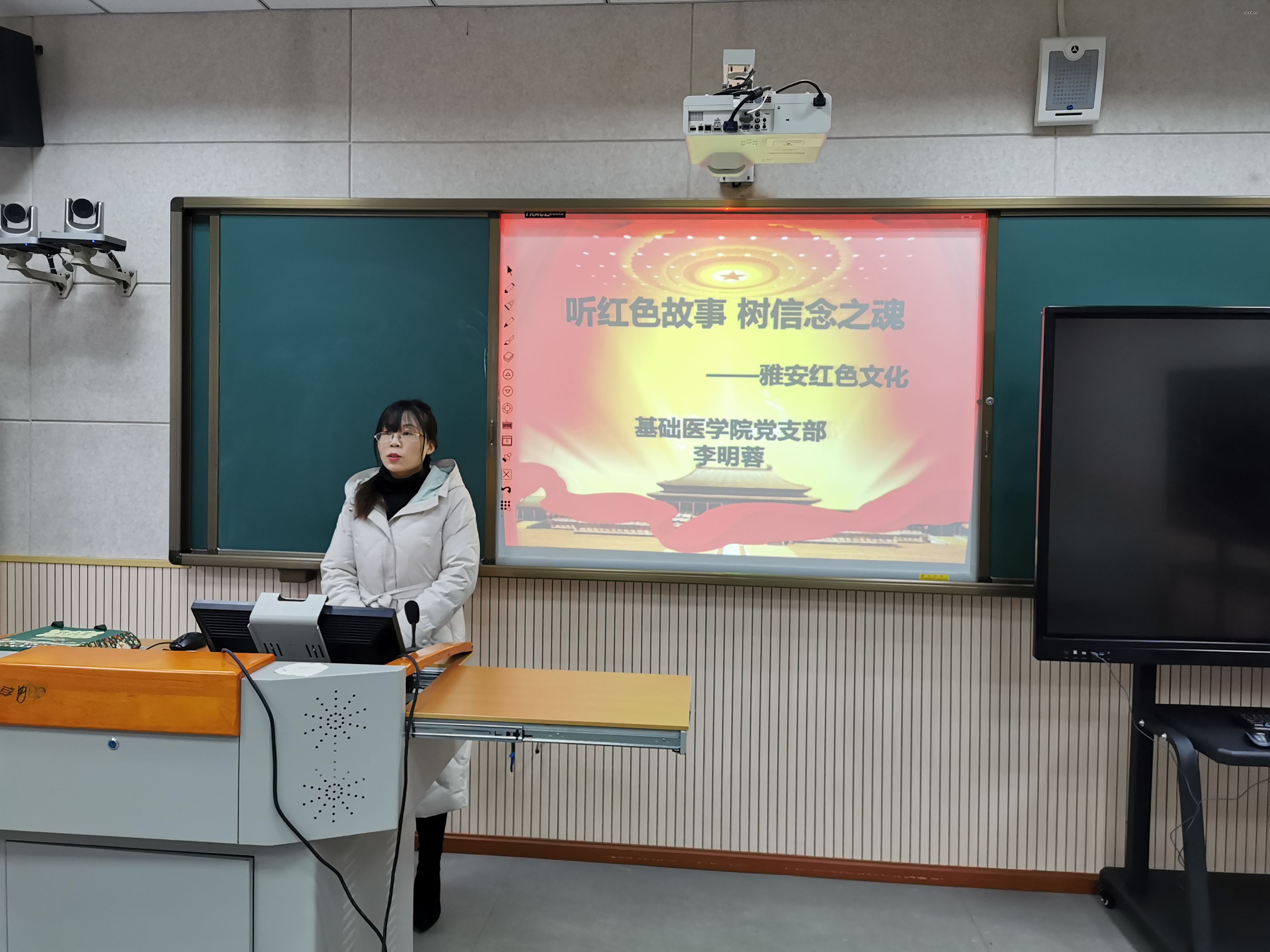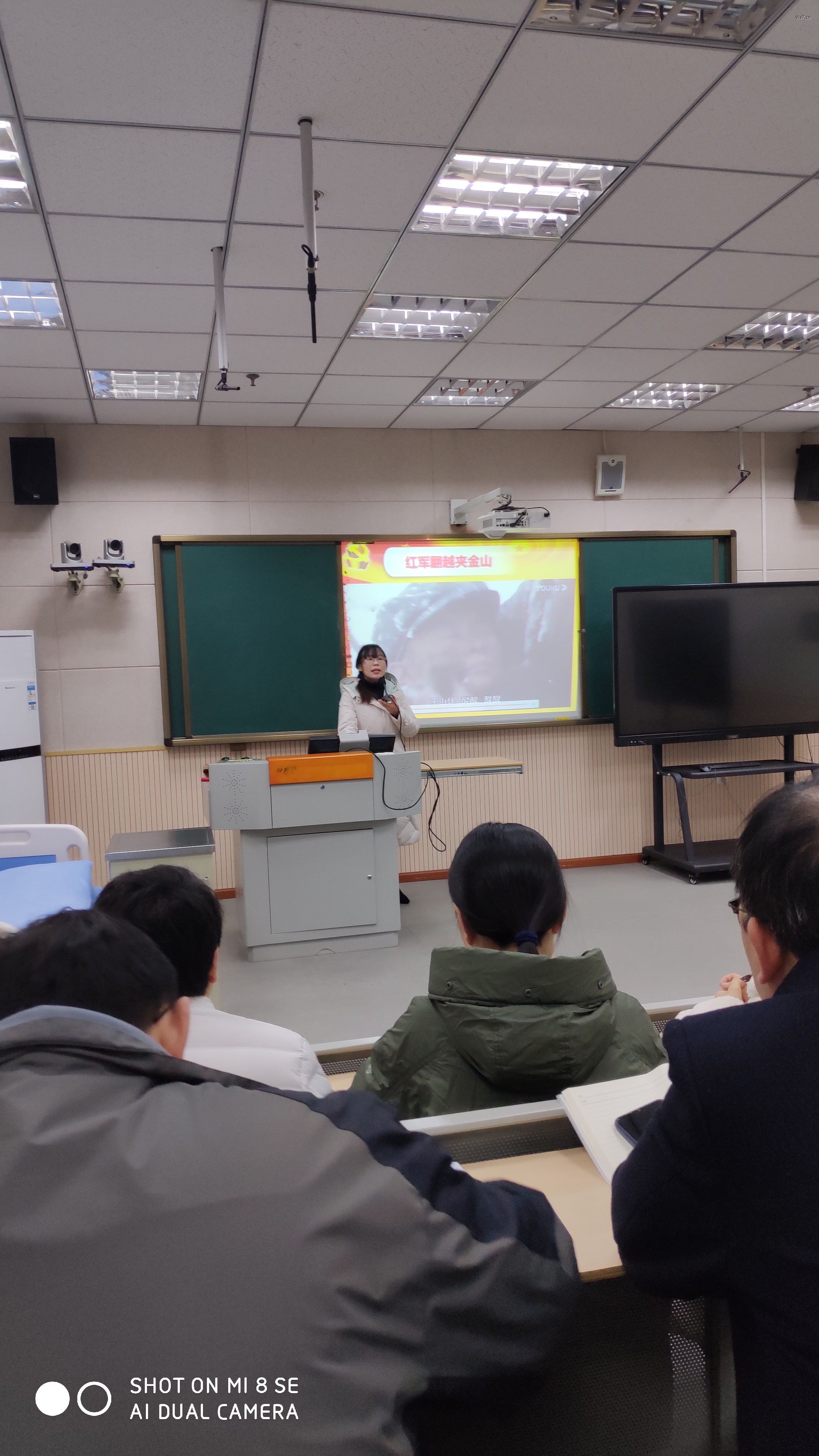 由支部宣传兼维稳委员李明蓉以“听红色故事  树信念之魂”为题讲了一堂生动的党课。她以上里红军碑林、红军翻越夹金山、红军强渡大渡河历史为背景,结合视频播放讲了3个感人肺腑的故事。听完故事,老师们表示,不能忘记那些为了和平,为了祖国的胜利而抛头颅洒热血的烈士们,如果没有他们昨日的牺牲,祖国就不会有今天的辉煌!