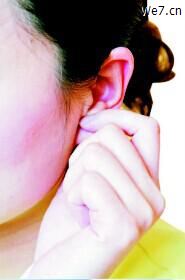按耳窝:先按压外耳道开口边的凹陷处,此部位有心、肺、气管、三焦等穴,按压1 5—2 0下,直至此处明显的发热、发烫。然后,再按压上边凹陷处。此部位有脾、胃、肝、胆、大肠、小肠、肾、膀胱等穴,同样来回按压1 5—2 0次。