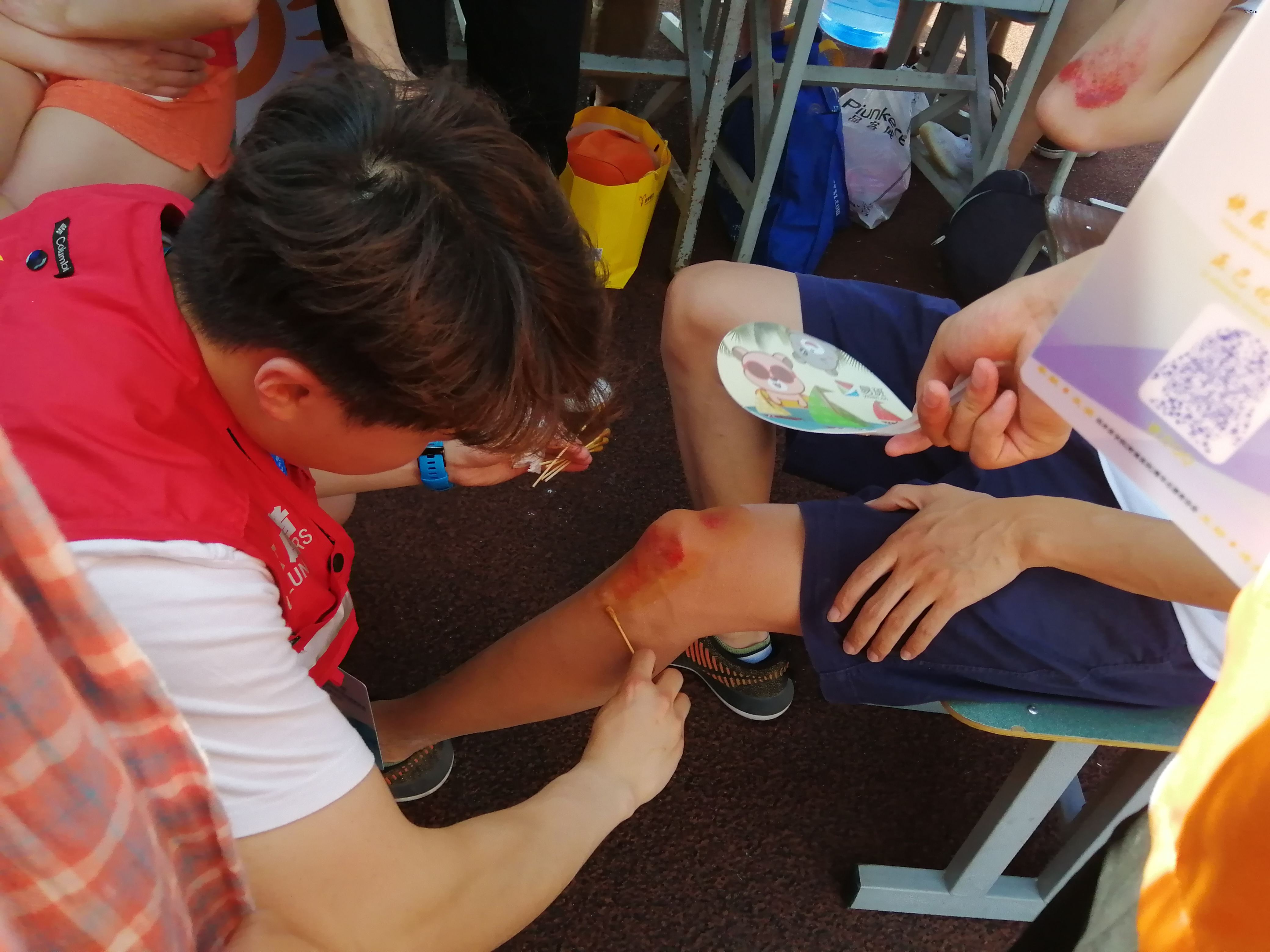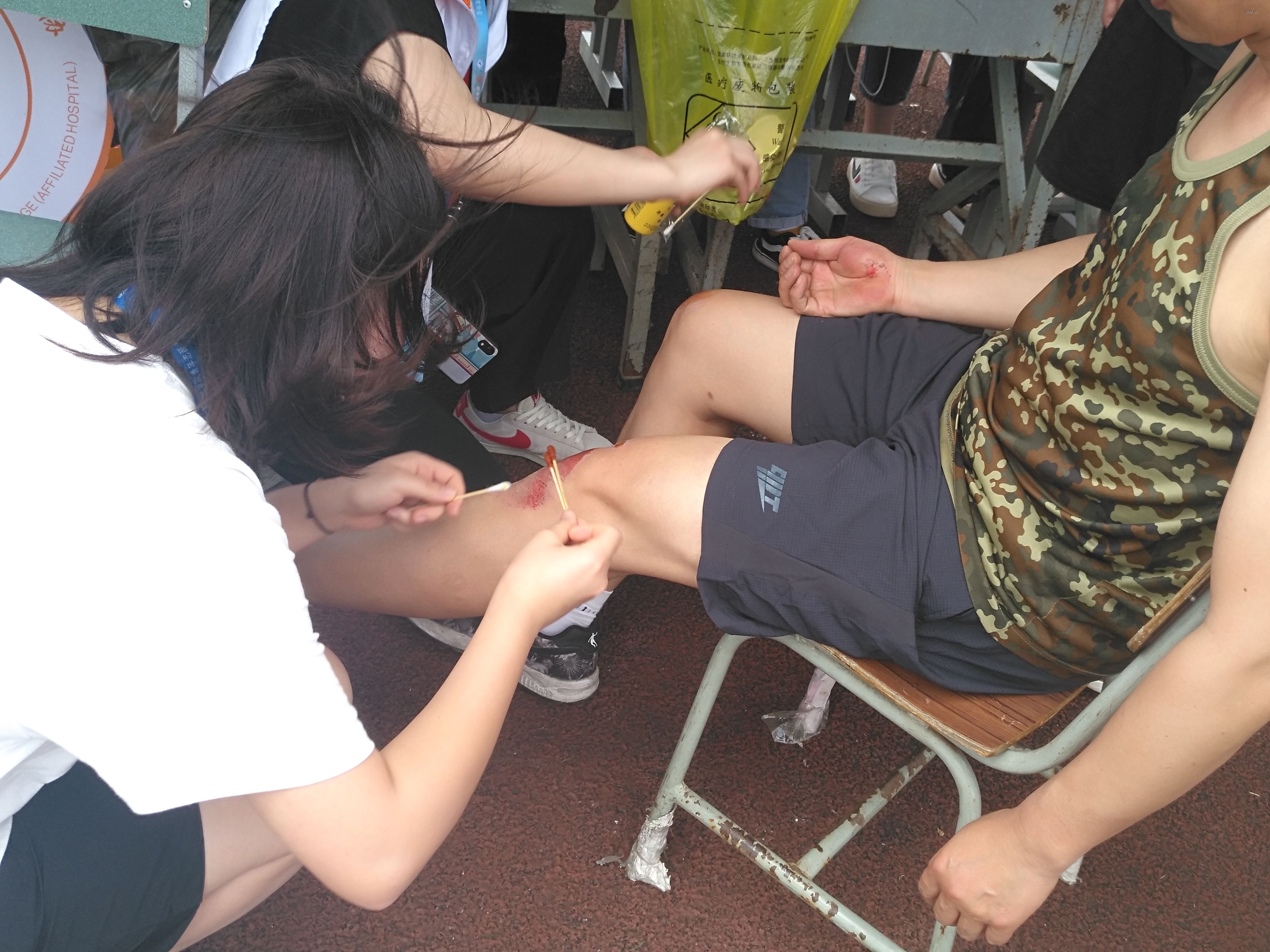 运动会3天,志愿者在烈日下轮流值班,坚守岗位,为受伤的运动员们提供帮助。对运动中可能出现的扭伤、擦伤等意外伤害,准备了充足的救护物资;如:葡萄糖、藿香正气液、云南白药、口服补液盐、碘伏、棉签、冰袋等医疗用品。面对擦破皮的伤员,志愿者先是用生理盐水和棉签清洗伤口,然后用碘伏消毒,必要时用绷带包扎;扭伤的运动员,志愿者先对伤处进行冰敷、喷涂云南白药,后为伤员做拉伸处理。在现场救护过程中,面对不同的意外情况,志愿者们沉着冷静地应对、处理,将所学专业知识运用于实践,积累了经验。