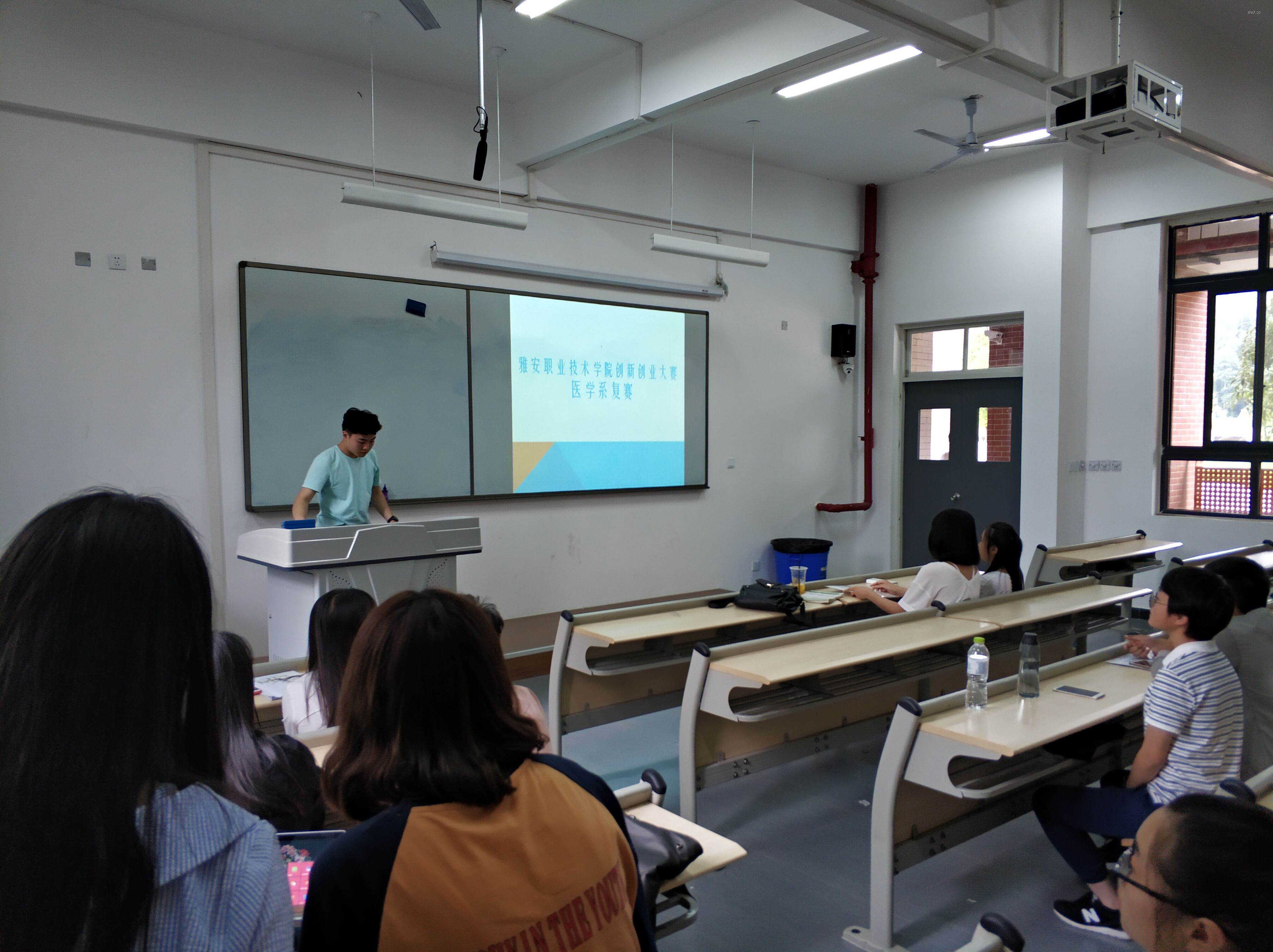 由医学系党支部副书记张翅老师、基础医学部副主任邓良超老师牵头,教研室老师、团总支老师协助组成的复赛评审团首先在87个项目中选拔出15个优秀创新创业项目参加复赛,复赛由PPT讲解和答辩两个环节构成。