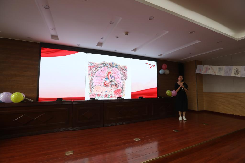 本次比赛共收到180幅作品,同学们用画笔在每一幅作品上生动地展示了人体的构造。通过解剖与组胚教研室教师初选,共有15幅作品进入决赛。决赛主要分作品介绍、老师点评、趣味问答三个环节。根据抽签顺序,每位作者依次对作品进行了介绍,解剖与组胚教研室教师进行了点评,评委老师根据作品的科学性、艺术性、人文性和整体性对其进行打分。大赛共评出一等奖一名、二等奖两名、三等奖三名、优秀奖九名。最终,普通专科公共卫生管理22级1班的陆昱橙同学的作品《消化系统》荣获本次竞赛一等奖。