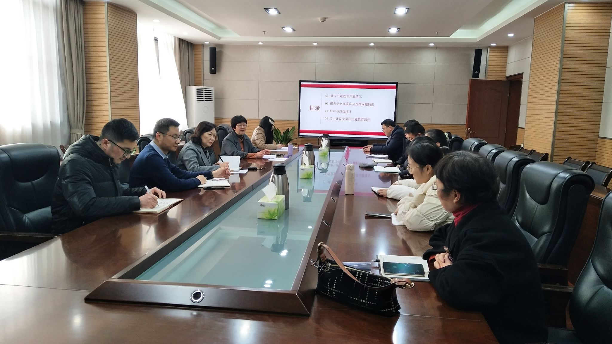 首先,孙玉锦代表支委会报告主题教育开展情况和通报党支部委员会查摆问题情况。按照支部列出的2023年9月-2024年1月主题教育学习计划,共召开党员大会5次、讲党课2次、主题党日活动4次、交流研讨4次、志愿服务1次、调研座谈1次、谈心谈话1次,均按照计划开展和完成了相关主题教育活动。支委围绕组织开展主题教育、执行上级组织决定、 严格组织生活、联系服务师生、抓好自身建设等方面,查找问题短板,梳理出了五个方面的问题:一是对照“三会一课”标准,存在支部委员会召开频度和主题党日活动开展频度不够的问题;二是会议记录不够规范的问题;三是党建工作开展活力不够的问题;四是谈心谈话制度落实还不够的问题;五是师德师风和学风建设需要加强的问题。针对以上问题,制定了整改措施,明确了责任人。