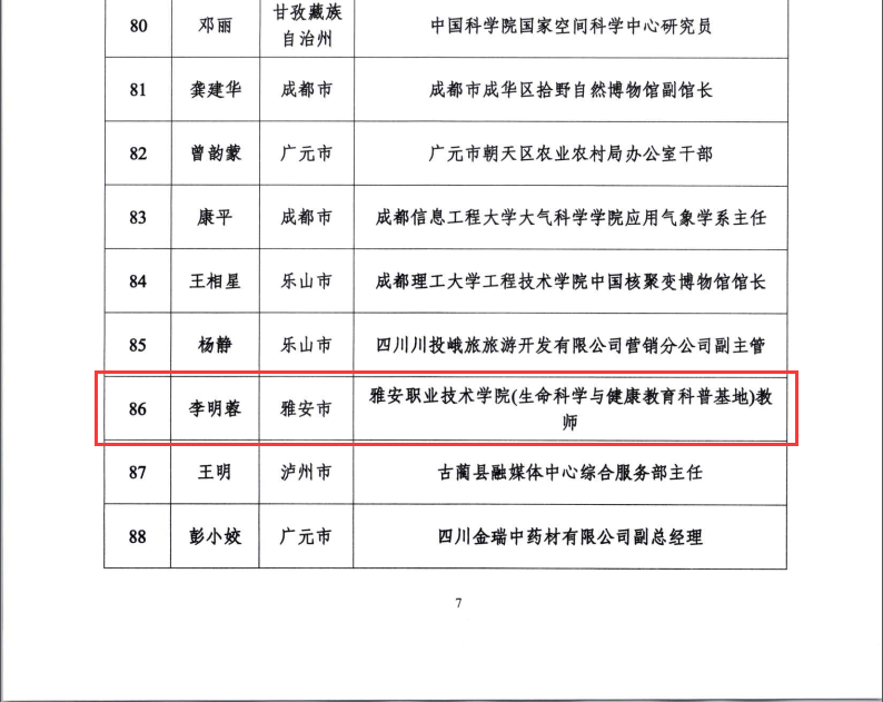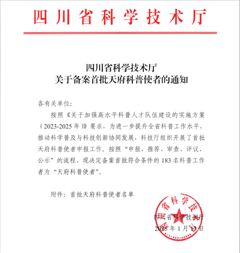 据悉,为进一步提升全省科普工作水平,推动科学普及与科技创新协同发展,科技厅组织开展了首批“天府科普使者”申报工作。经申报、推荐、审查、评议、公示等程序,全省共有183名科普工作者备案为首批“天府科普使者”,其中雅安市共获备案5人。