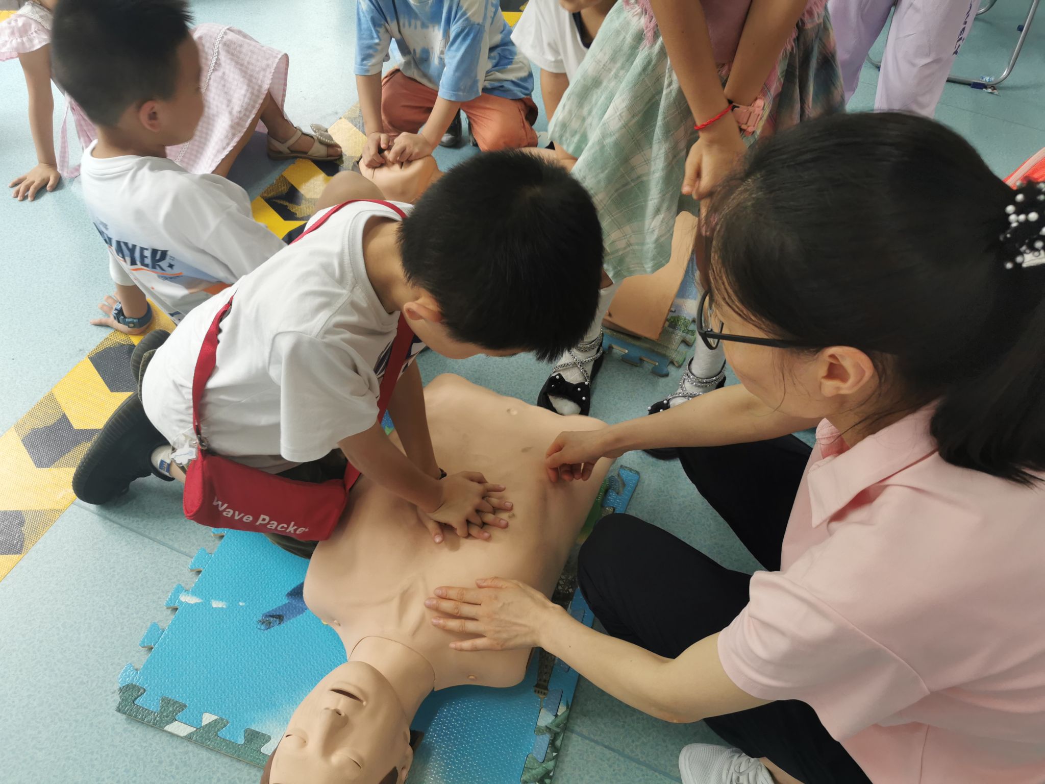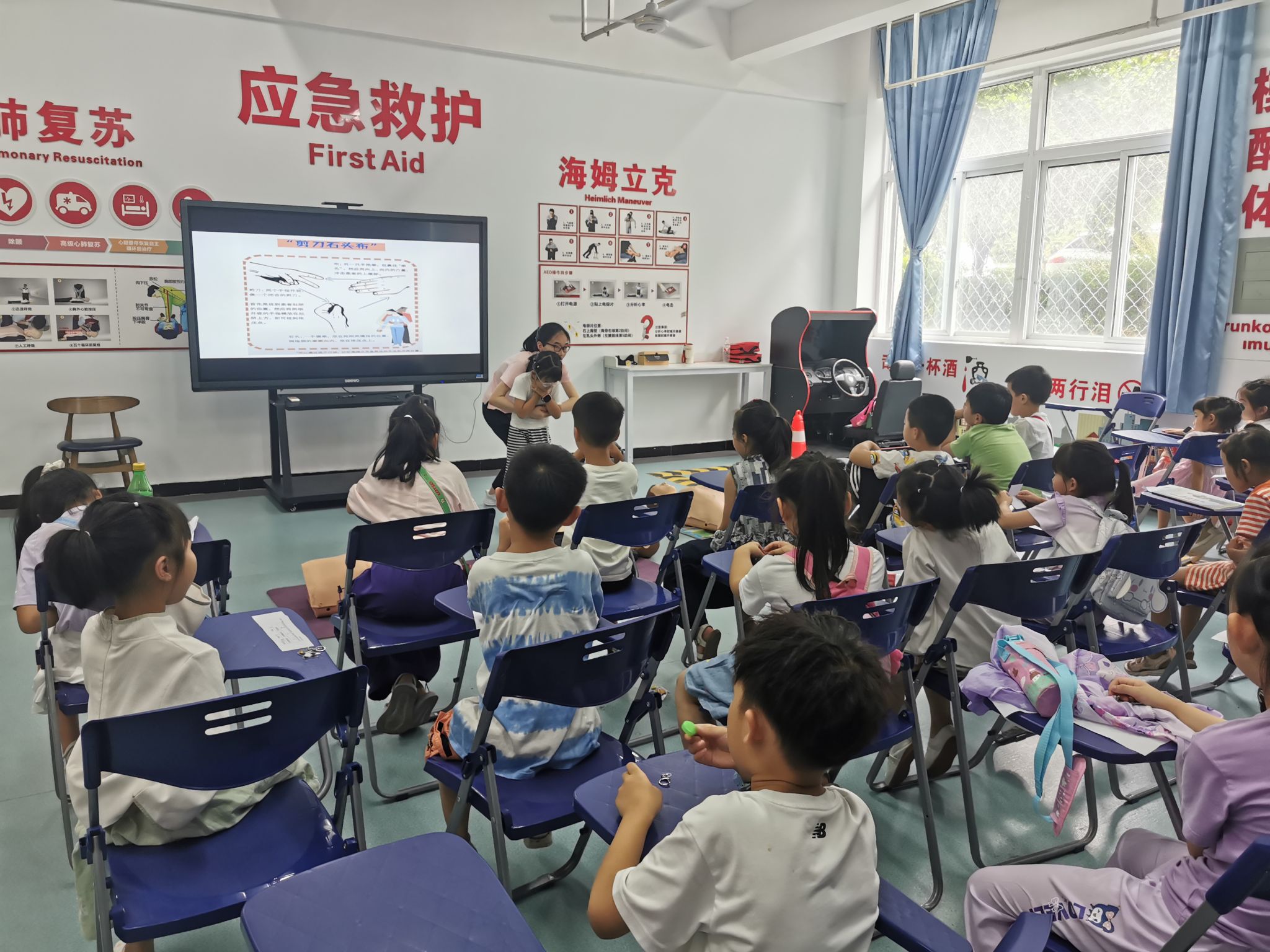 C202,陈慧和朱秉裙老师给同学们讲解了眼球的基本构造和近视的相关科普知识,为同学们做了裸眼远视力测试和色盲测试。同时对筛查出的视力异常小朋友与班主任进行了沟通,建议去医院进行复诊,做到早预防、早发现、早干预。同学们在综合实训楼106学习了意外伤害和急救。程志超和任丹老师向同学们展示了心肺复苏和海姆立克急救法等操作,并对同学们的操作进行现场指导。