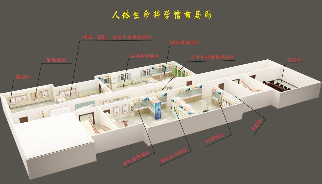 具,神经系统局部器官塑化标本和模型,及相应文化。感觉器官展区展出感觉器官整体和局部塑化标本、模型,及相应文化;断层展区展出